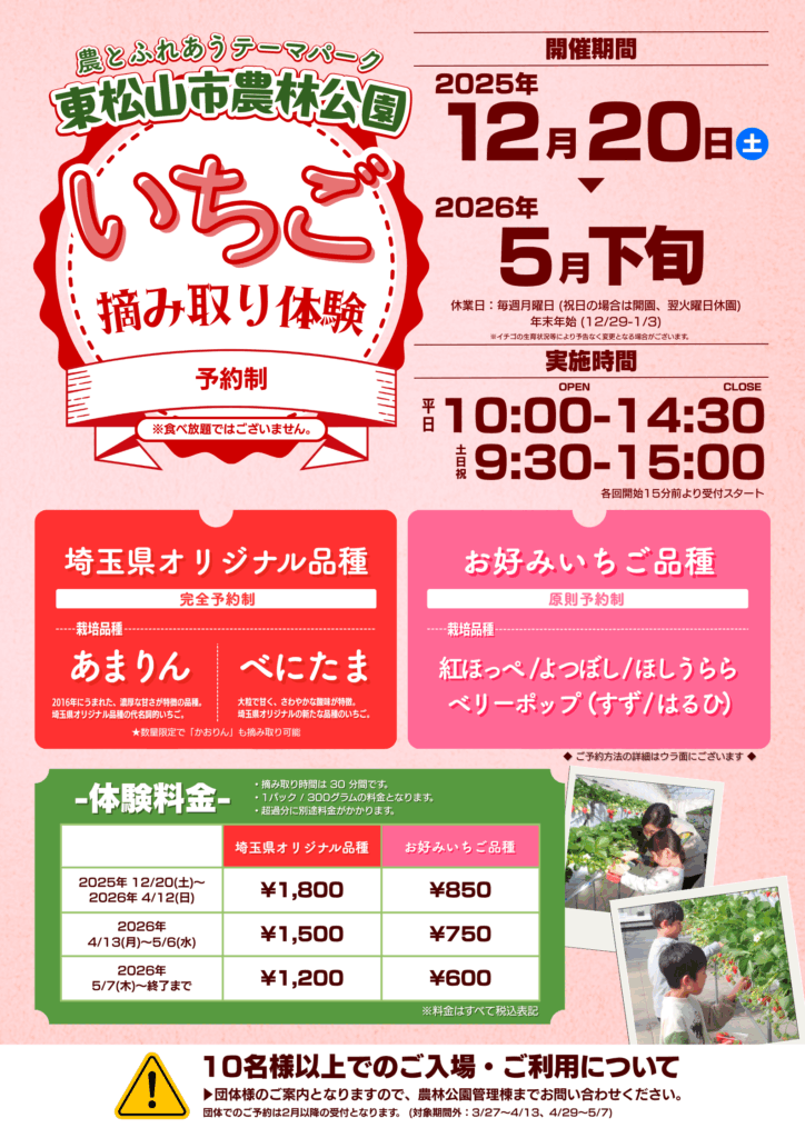 毎年大好評をいただいている東松山市農林公園の「いちご摘み取り体験」が、12/20(土)から開始となります。