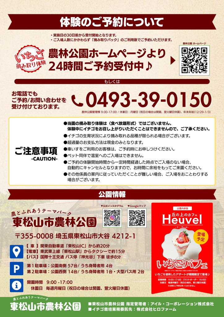 電話番号:0493-39-0150 (農林公園管理棟 9:00-17:00)